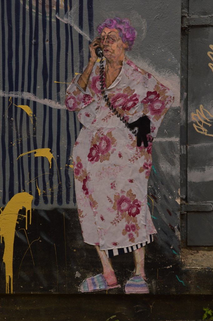 Installation “Granny mafia- they know what you did and they’re telling”. Materials used: acrylic on paper and textile. Glued to the walls of public places with flour and water. Project was made in the summer of 2015, Vilnius.