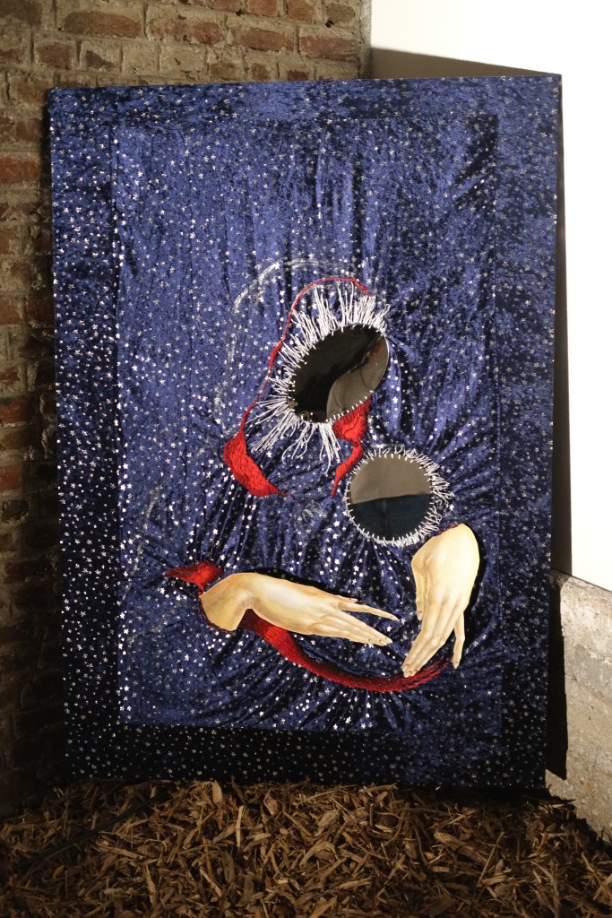 “Death” 162x114cm, watercolor, paper, mirror plexiglass, textile(sperrmull), threads, 2025