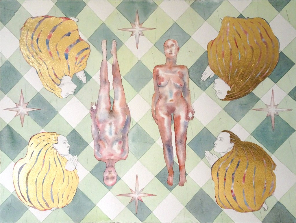 “Creature fear I, II” watercolor, paper, imitation gold leaf.