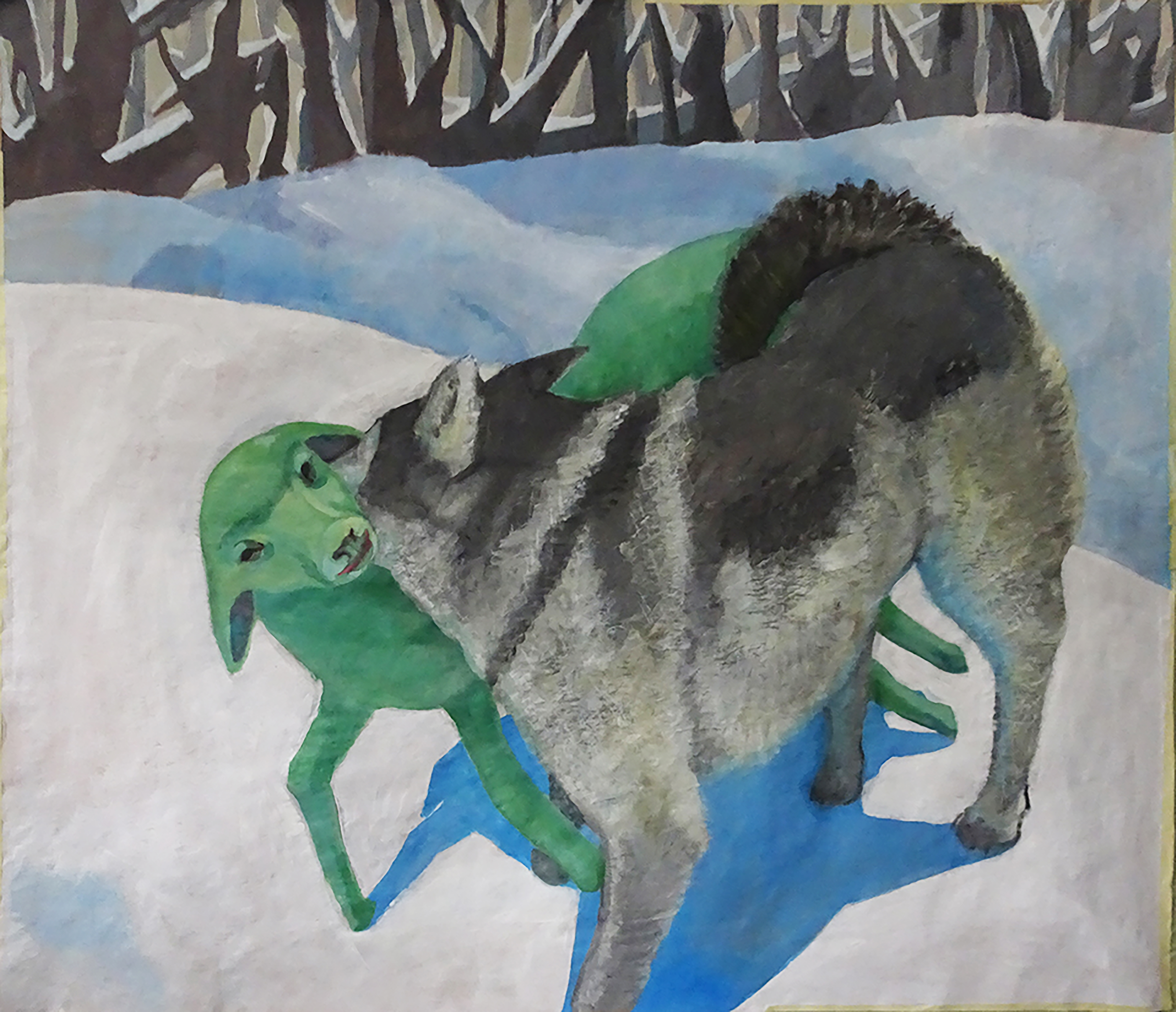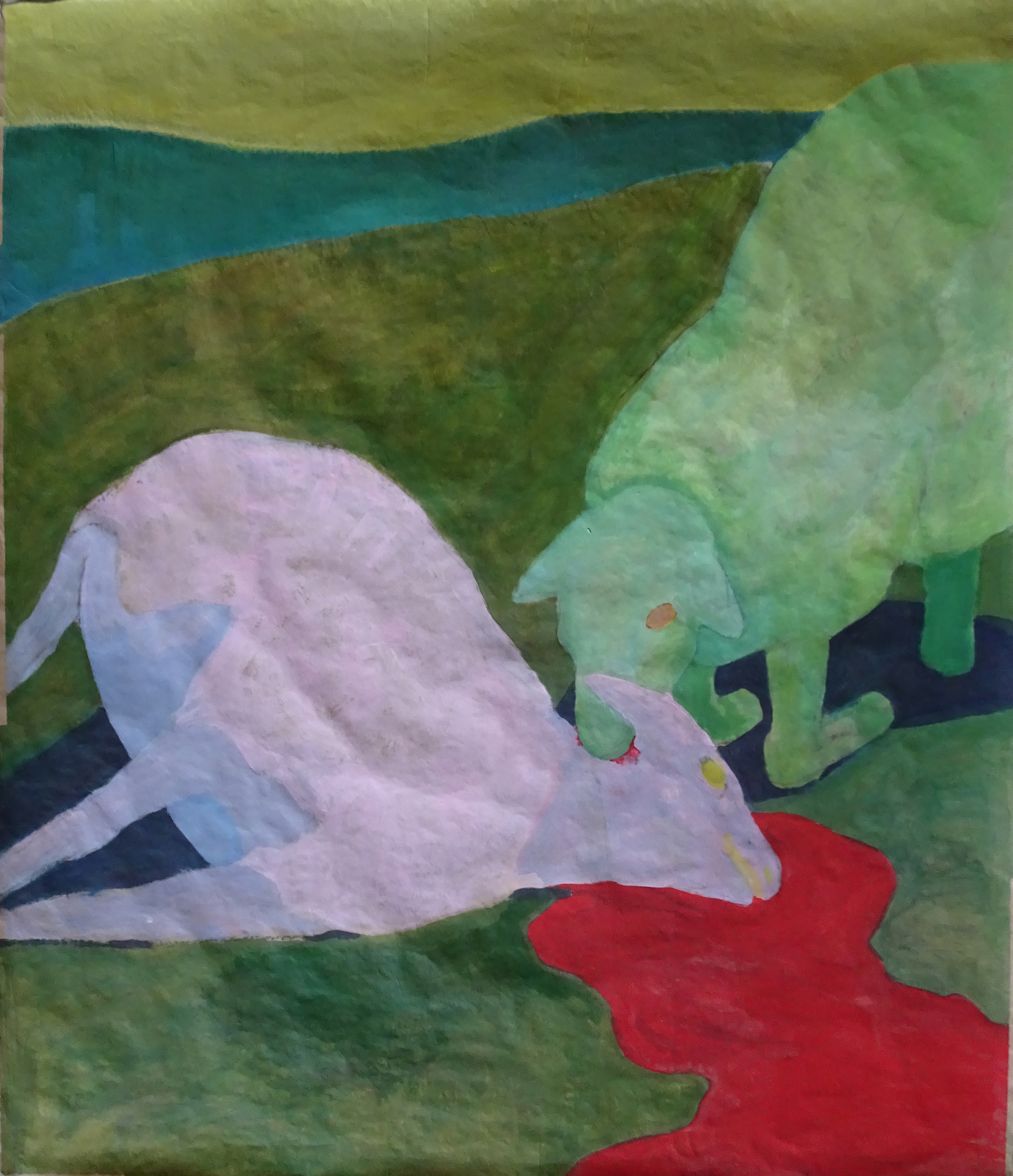 “Self-destruction room”- painting installation made in 2017. All works depict lambs that involve themselves in self-destructive activities: lamb eating another lamb; lamb falling in love with the wolf; lambs selling karakul furs; self-portrait in a fur.