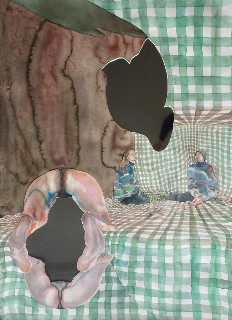 “Waiting” watercolor, paper, reflective paper, 100x70cm, 2025