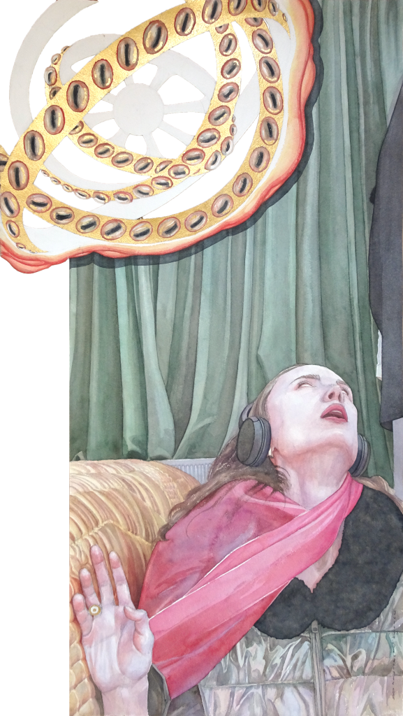 “Rolls” watercolor, paper, imitation gold leaf, 100x66cm, 2024