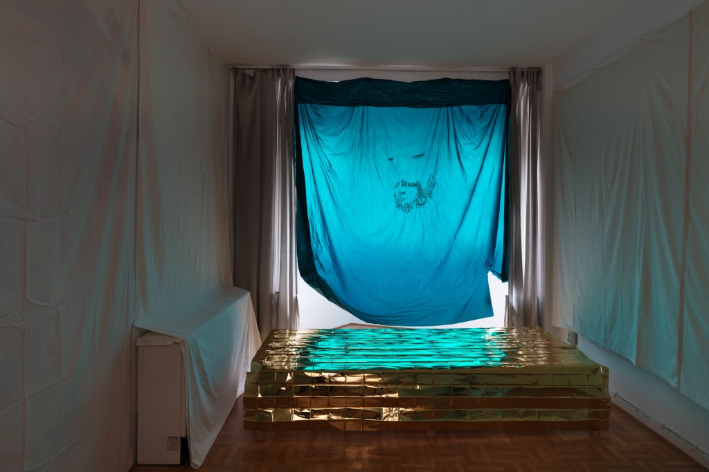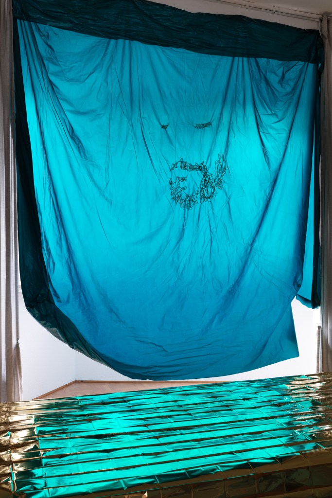 The last room. A green tint. In the middle, a rectangular object made out of golden tinfoil. An altar. No threads this time. On the far end of the room, a piece of fabric depicting the contours of a bearded face. Someone uses the term “skydaddy”. This room is very different, it radiates serenity, peace. It is much less threatening – and less interesting? – than the rest of the exhibition. It’s power is not the power of suspense, but the power of grounded silence.