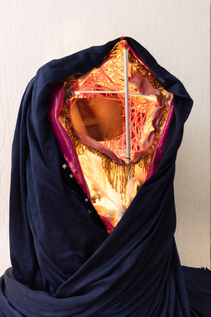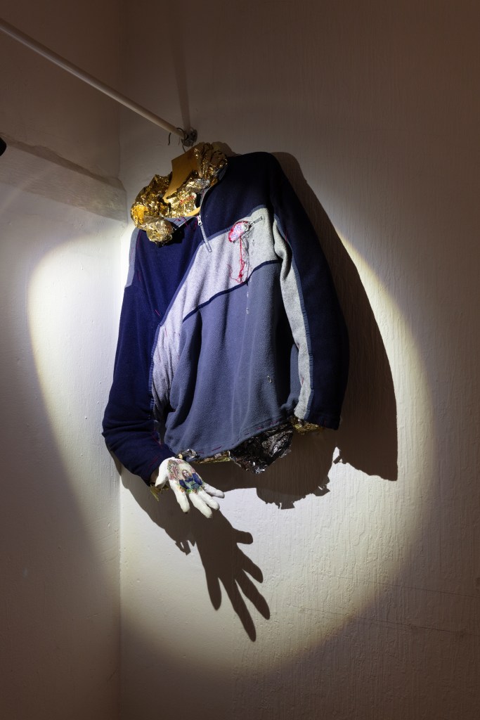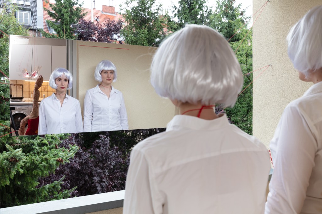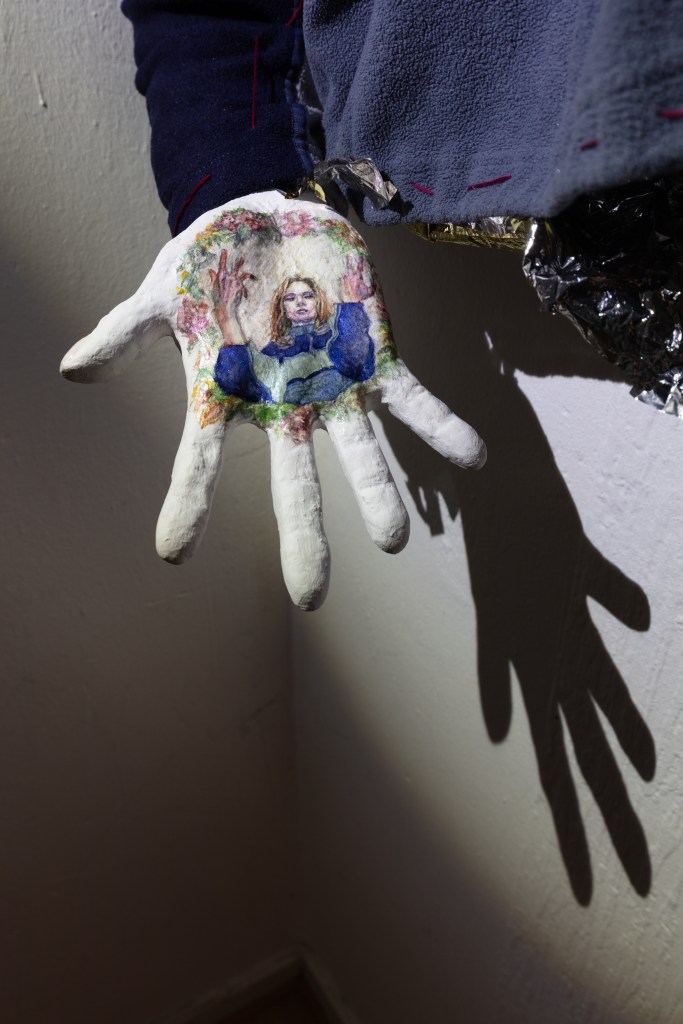 So when the day comes, you ring the bell. Once inside the apartment, you are greeted by two young women. Both clad in white, both wearing silvery whigs. A kind of uniform. With one voice, they welcome you, offering the choice between water and prosecco. The hallway exhibits two sculptures: To your right, you see a sweater adorned with something that looks like golden aluminium foil. From the right arm, a hand protrudes. On it, a small painting in the artist’s likeness, portraying her as the Virgin Mary. The other sculpture looks like a hooded head. There is light inside, and where the face should be you see a dark picture held by red threads.