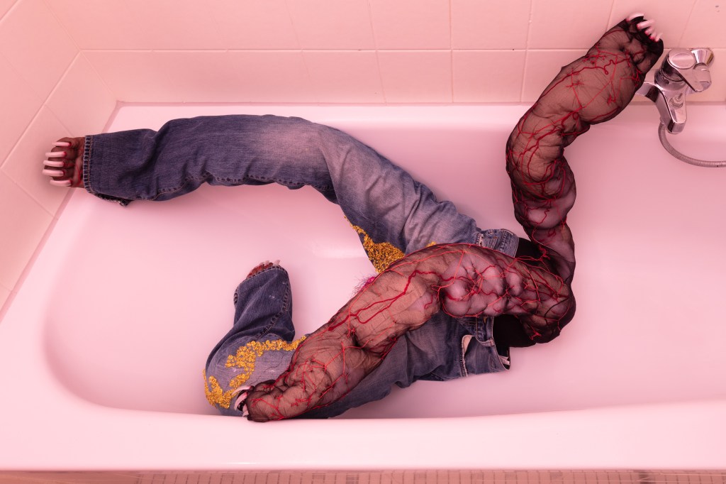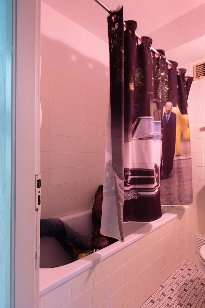 At some point, you will probably visit the bathroom. It smells of bleach. There is a single soap dispenser labeled “Station”. In the bathtub lies a figure similar to the one in the kitchen, this time with exposed scrotum, this time longing for the faucet, for water, for life.