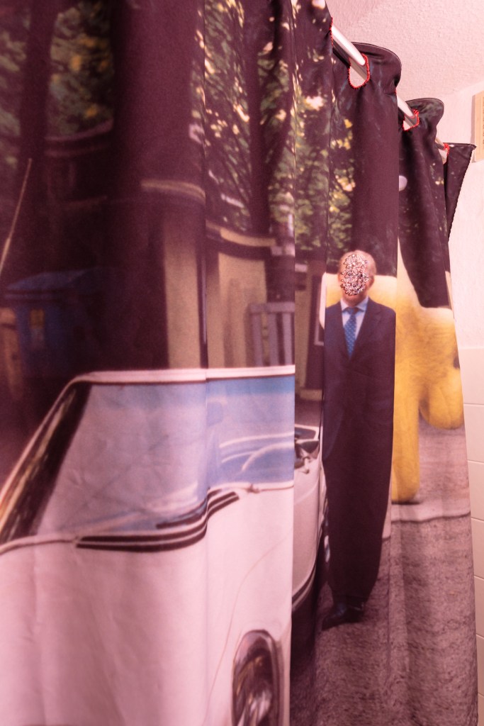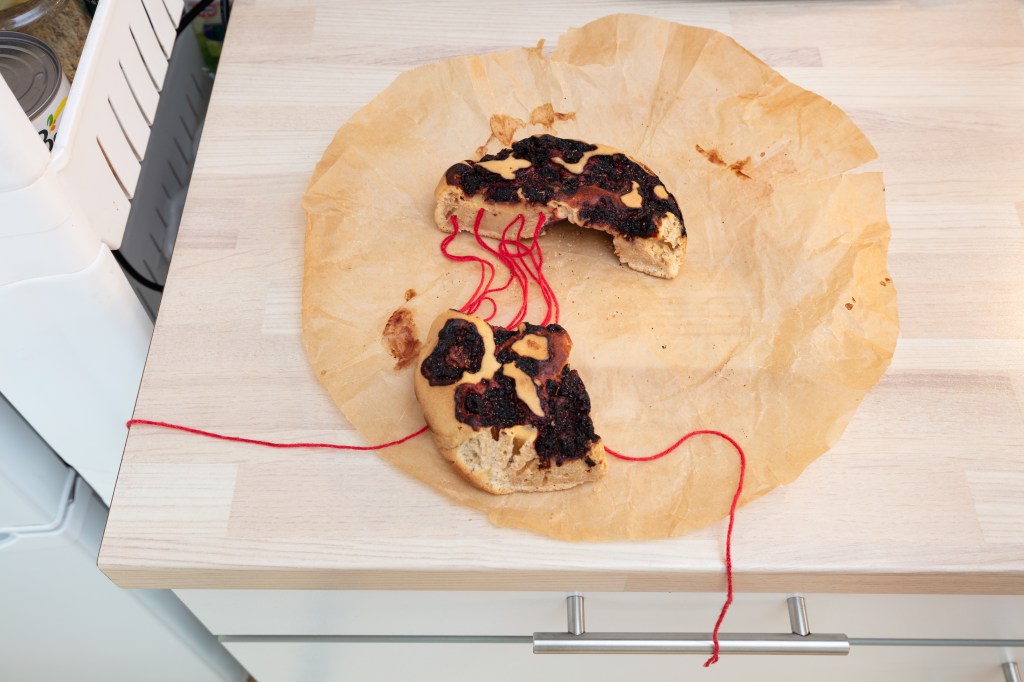 Everything is connected by red threads. They lead to the balcony, holding a large mirror up in the air. They lead to a sculpture of a black cat vaping arrogantly. For once, the symbolism is overt. Following the thread as in understanding whats up. A reference to “roter Faden”, a German expression denoting unity of different elements under a singular theme. But can you actually do it? Threads everywhere, and no easy answers.