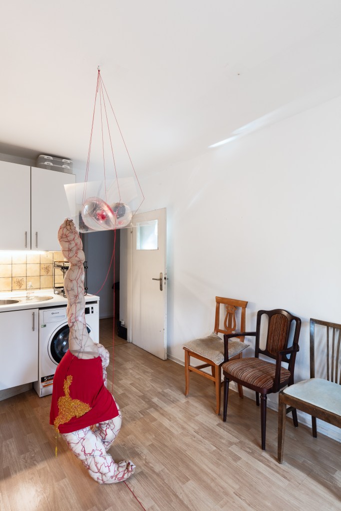 Entering the kitchen, your attention is immediately captured by a large puppet occupying the center of the room. Built from some pillow-like material and dressed in pants and other clothes, the headless, humanlike sculpture grasps for the sky. It looks kind of funny, and unsettling at the same time. Above it, placed on a translucent plane, lie two female breasts. A desperate scene inviting a psychoanalytic reading.